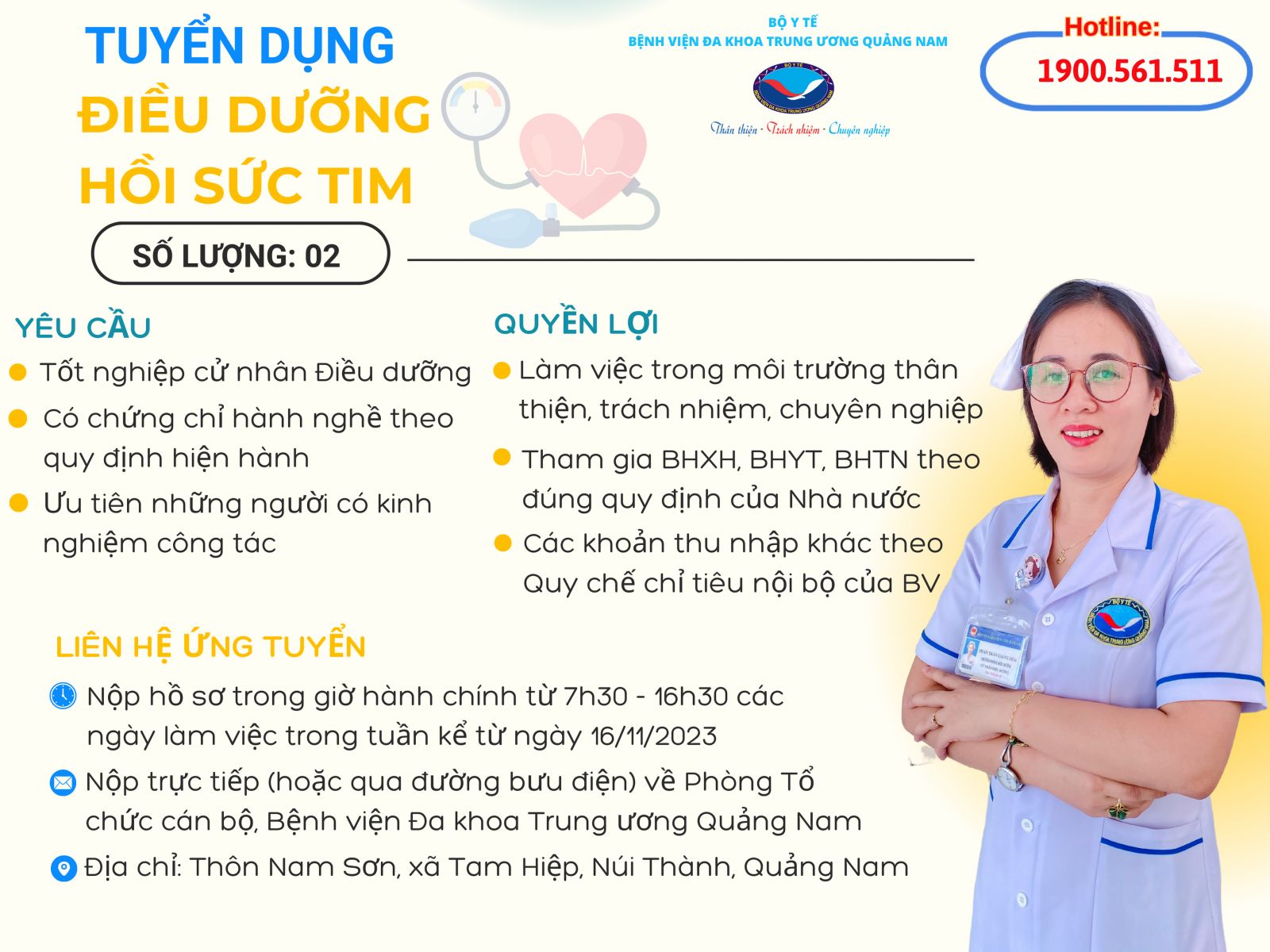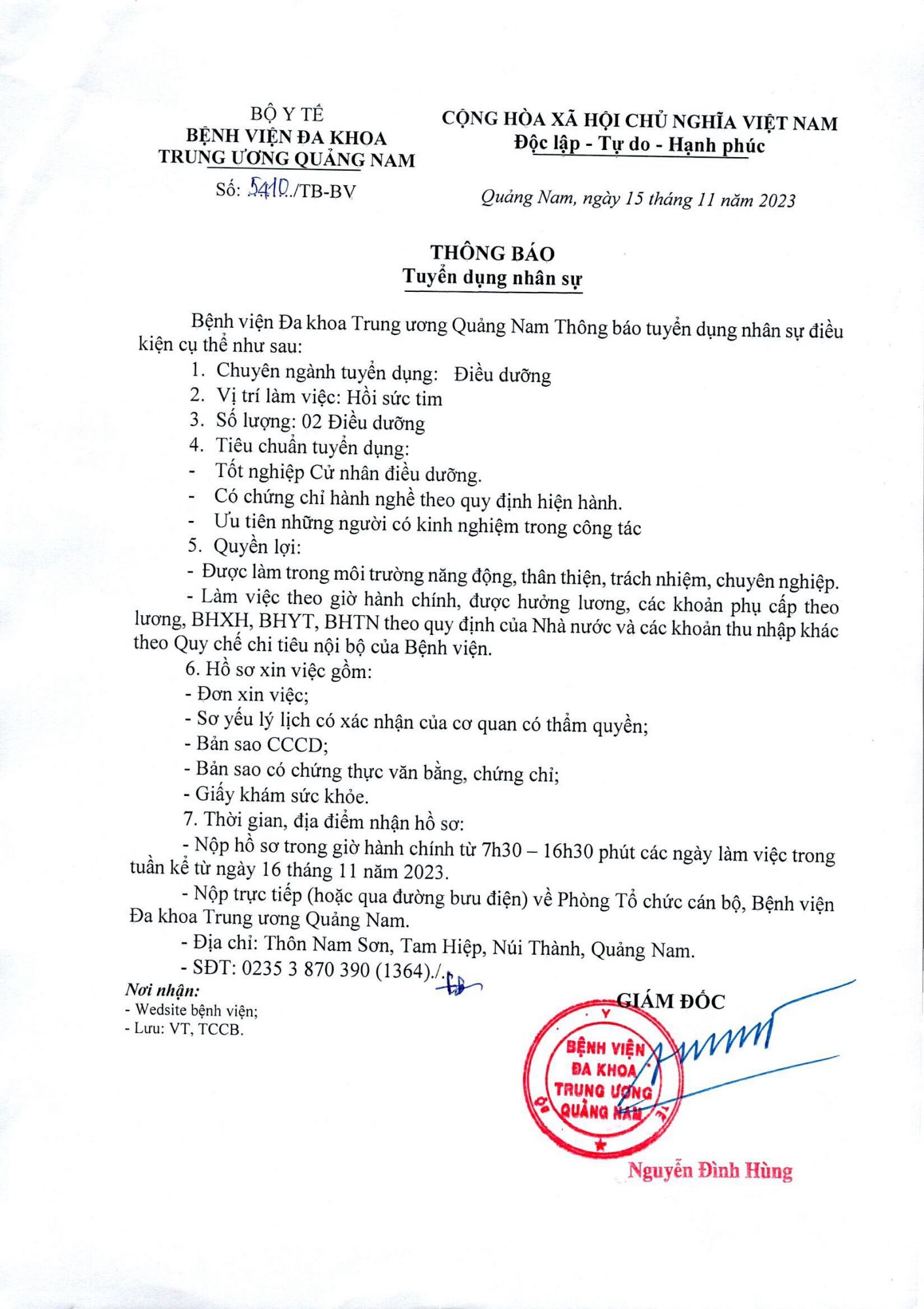 - Nộp trực tiếp (hoặc qua đường bưu điện) về Phòng Tổ chức cán bộ, Bệnh viện Đa khoa Trung ương Quảng Nam.