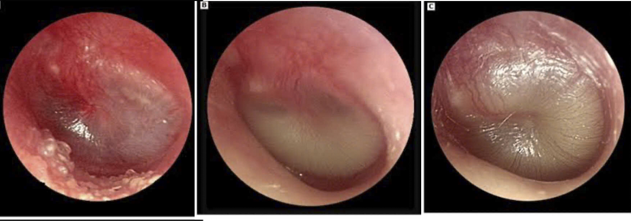 Hình nội soi tai diễn tiến viêm tai giữa cấp với màng nhĩ phồng kèm ứ đọng dịch đến tụ mủ tăng dần gây căng phồng màng nhĩ.