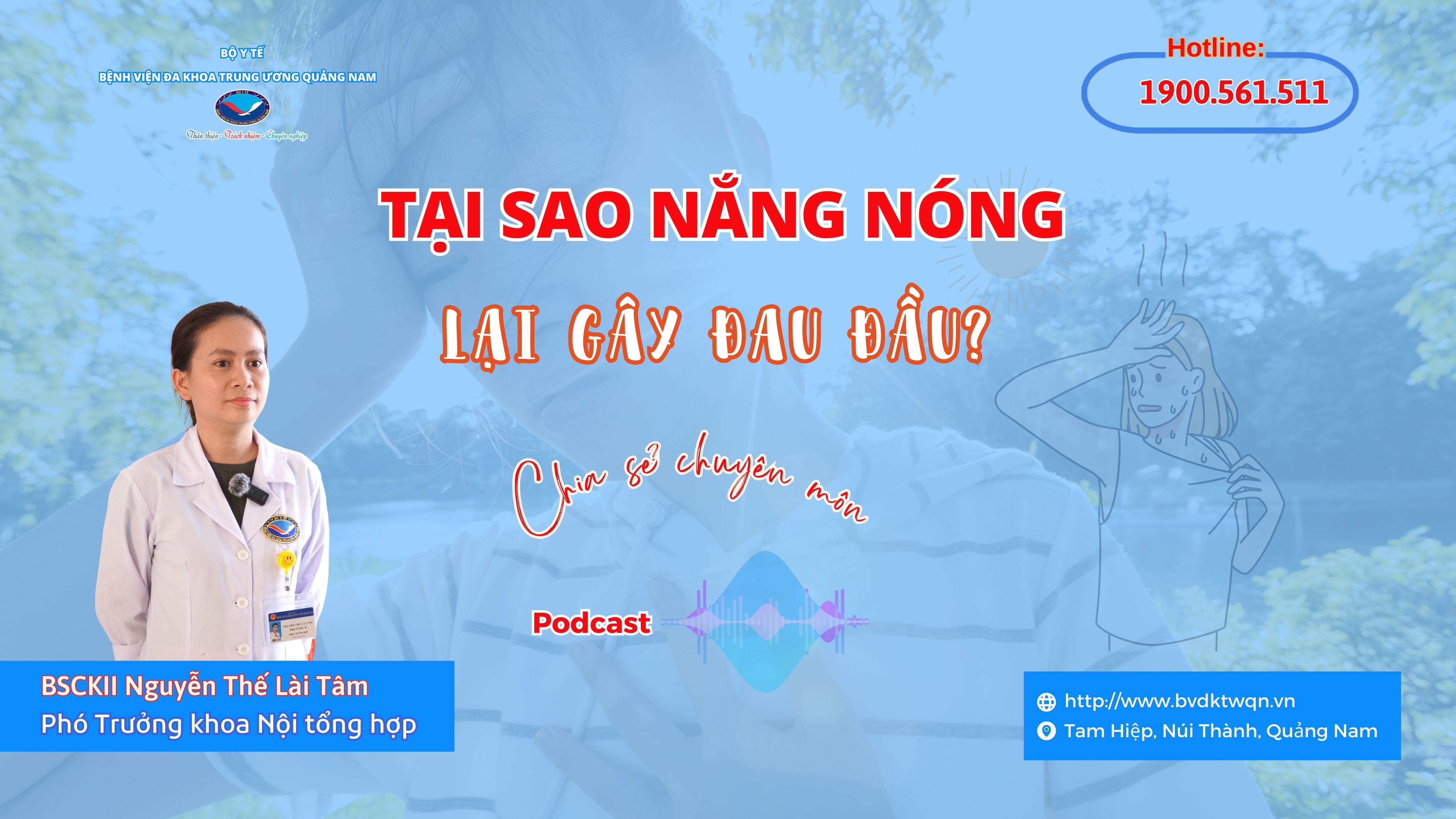 Mùa hè nắng nóng là thời điểm rất dễ làm bùng phát những cơn đau đầu cấp tính. Nhiệt độ tăng cao và tình trạng tiết mồ hôi nhiều là yếu tố chính gây ra tình trạng đau đầu. Đồng thời, chúng cũng khiến cho cơ thể bị mất nước, đuối sức. Cùng đến với số phát sóng Podcast với chủ đề: "Tại sao nắng nóng lại gây đau đầu" với sự tư vấn chuyên môn từ Bác sĩ CKII. Nguyễn Thế Lài Tâm, Phó trưởng Khoa Nội tổng hợp.